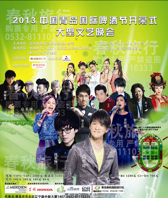 This year’s show will include famous singers from Hong Kong, Taiwan, Korea, and Main Land China. The main stars include: Emil, Bibi, Terry Lin, Julia Peng, & Huang QiShan (主要明星:周华健, 周笔畅, 林志炫, 彭佳慧, 黄绮珊, 文章等). Tickets range from 80 to 2880 RMB. Reservations Hotline: +86 (0532) 8111-0111; 8111-0333; 8111-0555, 8111-0666